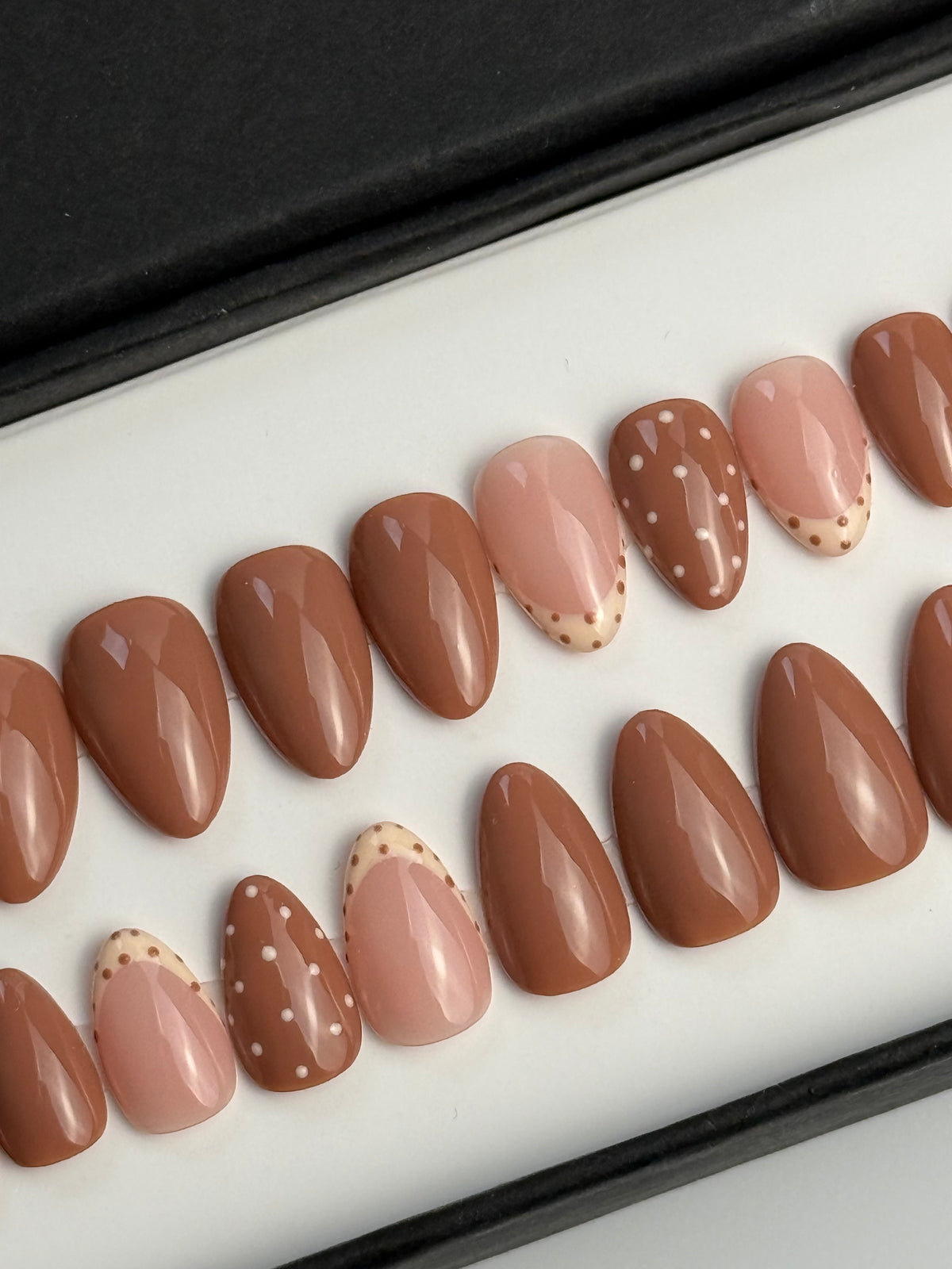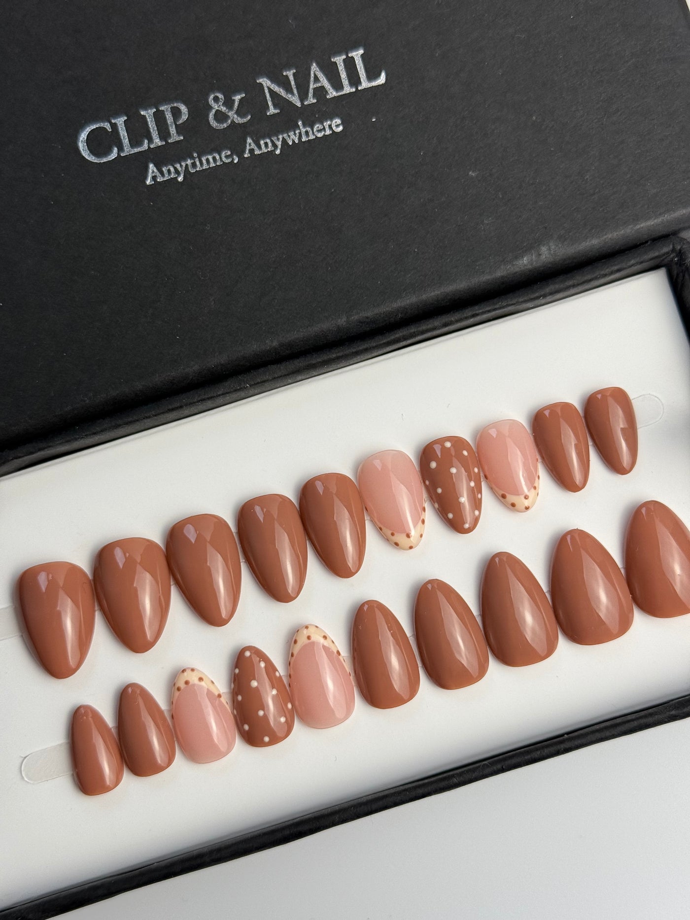 Un kit comporte 20 ongles de tailles différentes afin que chaque personne puisse trouver les press on nails qui correspondent à sa morphologie d'ongles. Un kit d'application est offert avec chaque kit.