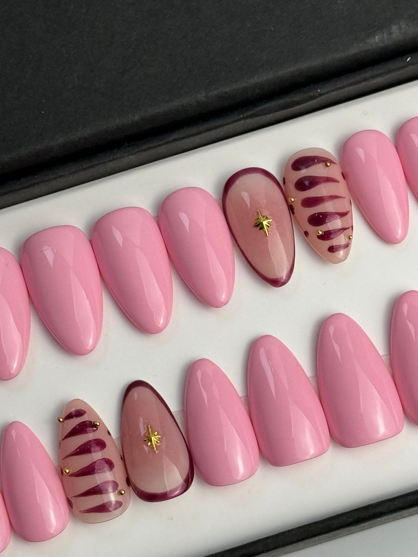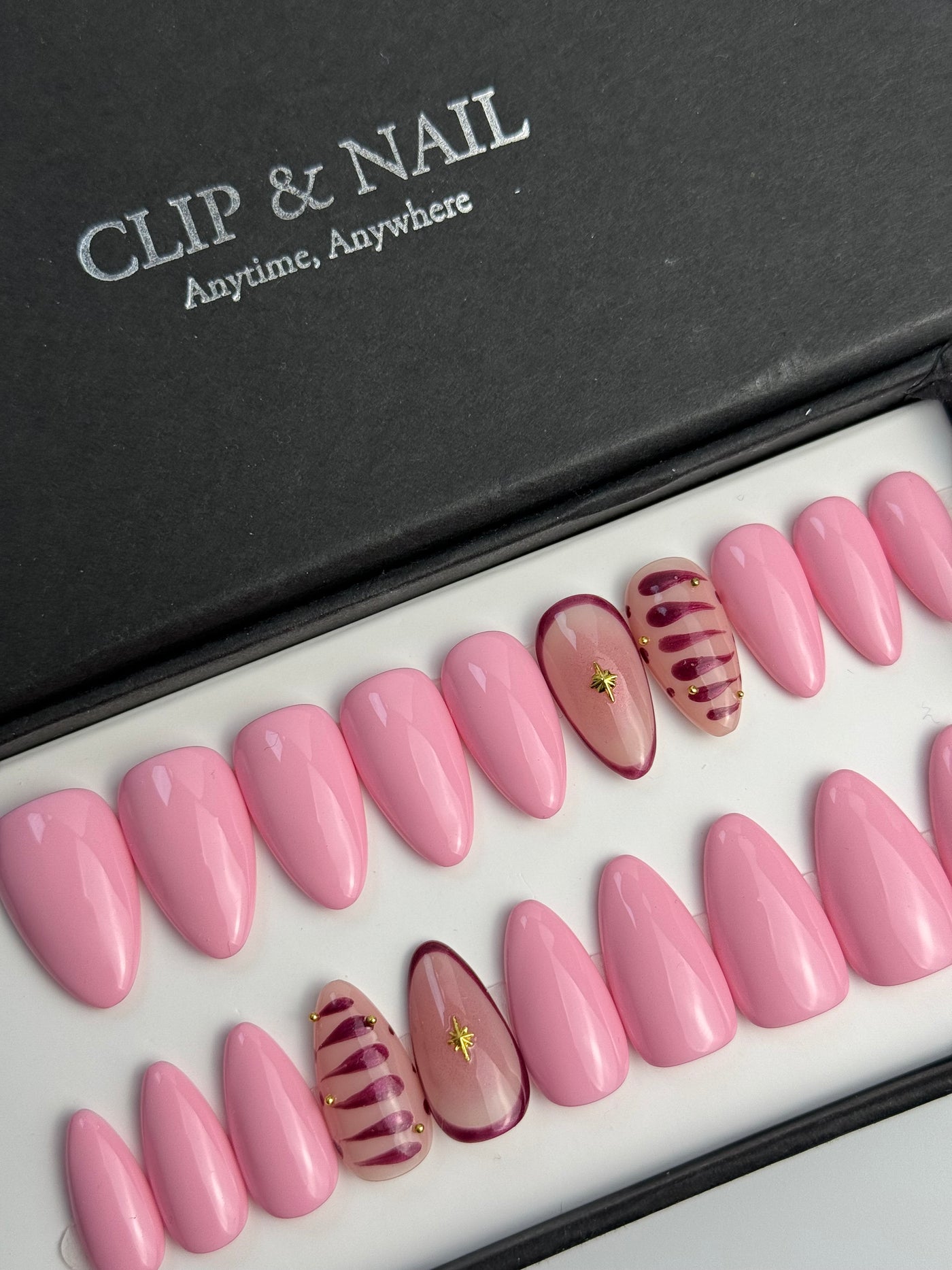Un kit comporte 20 ongles de tailles différentes afin que chaque personne puisse trouver les press on nails qui correspondent à sa morphologie d'ongles. Un kit d'application est offert avec chaque kit.