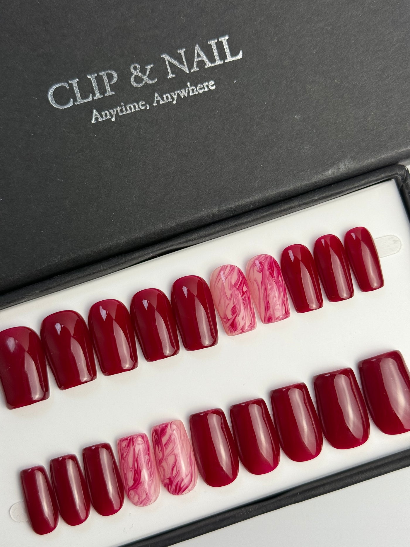 Un kit comporte 20 ongles de tailles différentes afin que chaque personne puisse trouver les press on nails qui correspondent à sa morphologie d'ongles. Un kit d'application est offert avec chaque kit.